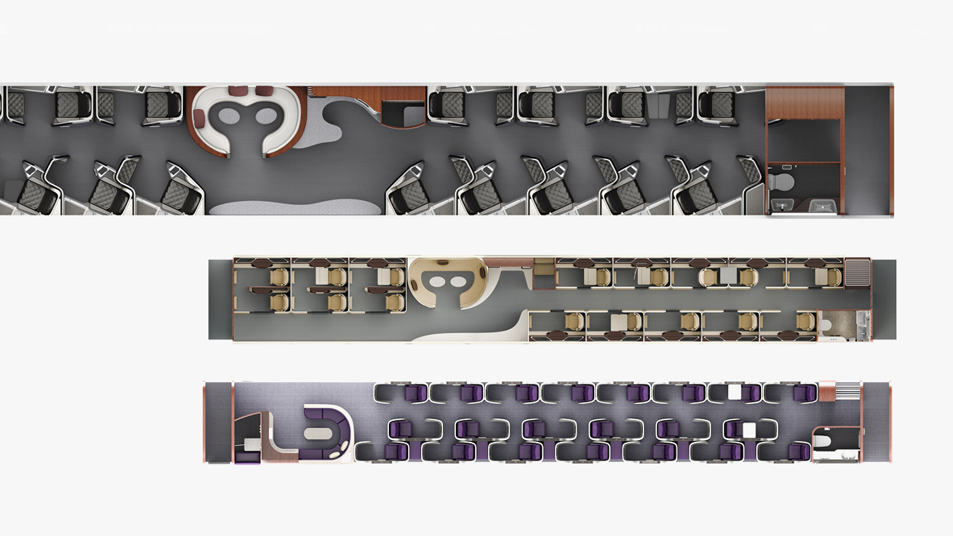 新設(shè)計(jì)按乘坐、用餐、乘務(wù)、洗手間、行李存放的功能劃分為5個(gè)區(qū)域,每個(gè)區(qū)域都配備了完整的功能設(shè)施。