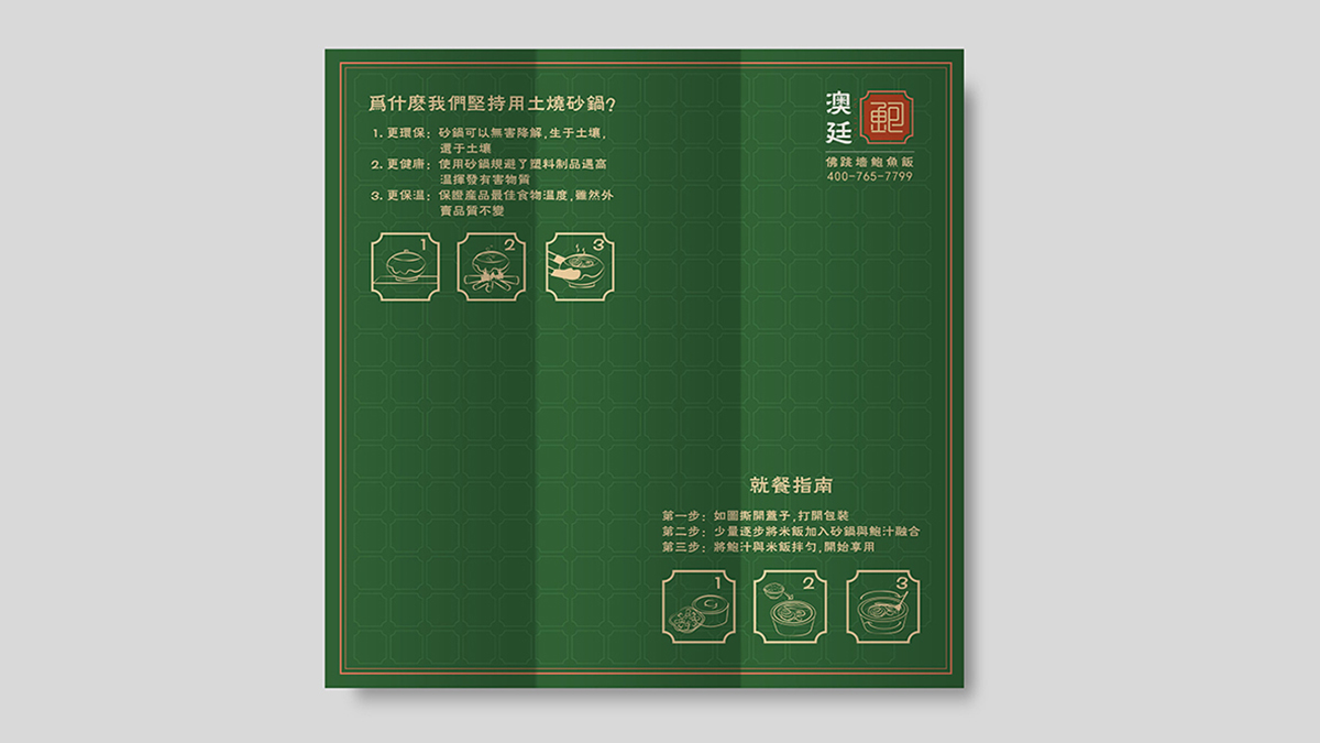 澳廷品牌標(biāo)識(shí)將“鮑”進(jìn)行字符號(hào)化,品牌形象以真正意義上的“鮑魚(yú)專(zhuān)家”為主題,結(jié)合中式的窗格元素。整體簡(jiǎn)潔鮮明,年輕化,符號(hào)化的logo易傳播,辨識(shí)度高。色彩上運(yùn)用對(duì)比色紅色與綠色結(jié)合,在視覺(jué)上具有很強(qiáng)的沖擊力。