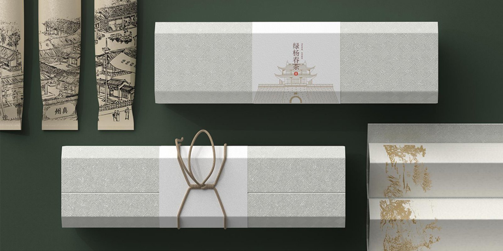包裝整體的卷軸形式靈感來源于宋朝買茶時的手提紙包。用戶打開時,有真州八景層層映入眼簾。以真州標志性建筑鼓樓作為腰封圖案,更顯端莊。內(nèi)部茶包上展現(xiàn)了宋朝時期真州大都會橋上的茶交易盛景,讓人通過飲茶感受到古時與今日絲絲縷縷的傳承和牽絆。